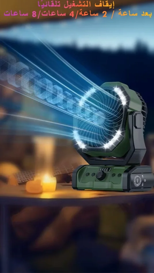 - تتميز مروحة التخييم المحمولة القابلة لإعادة الشحن بأربع سرعات رياح قابلة للتعديل. يمكنك الاختيار من بين النسيم اللطيف إلى الرياح القوية وفقًا لتفضيلاتك. تحتوي المروحة التي تعمل بالبطارية أيضًا على وظيفة المؤقت، مما يسمح لك بضبطها لإيقاف التشغيل تلقائيًا بعد ساعة / 2 ساعة/4 ساعات/8 ساعات. في وضع النوم، سيتم إيقاف تشغيل جميع مصابيح المؤشر، مما يوفر لك بيئة نوم أفضل..