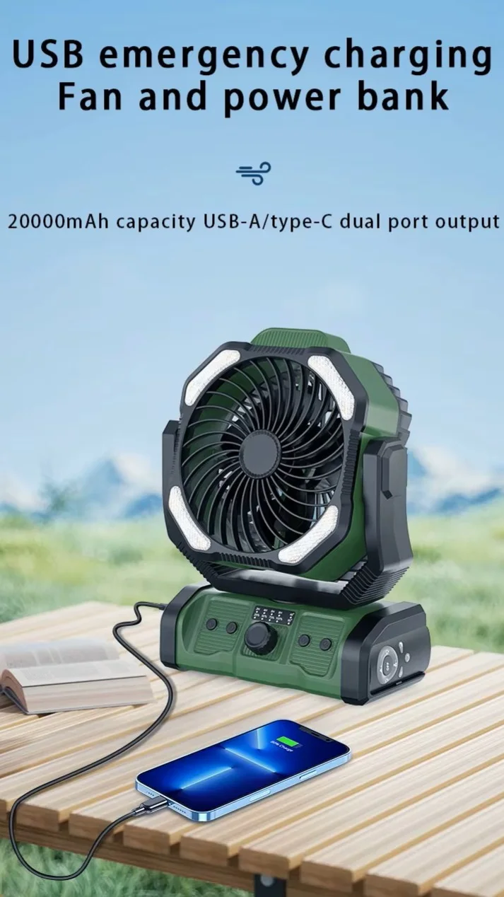 - مروحة بطارية التخييم هذه مجهزة ببطارية قوية 20000 مللي امبير في الساعة. باستخدام كيبل نوع سي المتضمن، يمكن شحنه بالكامل في 8-9 ساعات بمدخل 5 فولت - 3 امبير. يمكن أن يعمل بشكل مستمر لمدة 10-100 ساعة في أوضاع مختلفة، مما يوفر لك تجربة تبريد تدوم طويلاً. تتميز مروحة التخييم التي تعمل بالبطارية أيضًا بمنفذ شحن USB-A مما يوفر طاقة الطوارئ لأجهزتك الإلكترونية، مما يجعلها خيارًا ممتازًا لرحلات التخييم وانقطاع التيار الكهربائي والأعاصير والمزيد..
